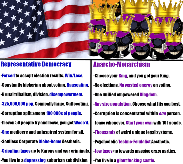 Structure and Hierarchy: An Anarcho-Monarchist society could be structured in many different ways. The Monarch’s role could be to provide voluntary private defense or an Anarcho-Monarch’s job could be very similar to a Homeowner Association’s President. An Anarcho-Monarchy would be primarily funded through contractual monthly fees or other potential services. What separates Anarcho-Monarchism from traditional Statist Monarchies is the fact that Anarcho-Monarchism is based around voluntary association and private contracts rather than unnecessary violence and extortion. You can boycott a crony Monarch like any other private business if you so desire. This level of personal freedom means the real political power is always in the hands of individual private owners. This means that any individual wishing to enter a potential private governance industry that could form in a stateless society would need to respect the interest of their subjects (clients/tenants) or risk bankruptcy or being violently overthrown if they attack their consumer base. Choose your King, form your own Kingdom with friends who agree with you, or you can leave an Anarcho-Monarchist community and choose or create another non-Monarchist social order based on your preferences, so long as it’s voluntary. This means that Anarcho-Monarchism isn’t hostile towards the existence of other Anarchist philosophies so long as they’re voluntary. One of the greatest aspects of Monarchism is how easy it is to destroy if a Monarch goes too far. Democratic societies tend to have much more elected representatives in office as well as a majority vote that sympathizes and voted for said representatives. This makes democratic societies difficult to demolish if the majority vote goes too far and advocates for policies that strip away freedoms from the minority vote. This is why I see democracy as nothing more than mob rule in its purest form.